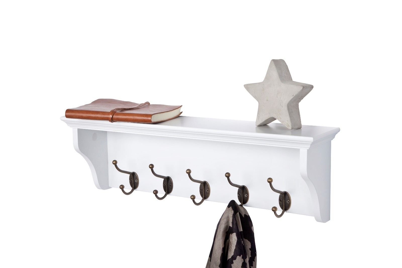 Richmond Wall Mounted Coat Rack - 5 Double Hooks. Create a light and airy space with this shaker style coat rack. With its clean lines, elegant crown moulded shelf and 5 double antique brass effect hooks below it is as much a feature piece as a useful storage addition.
