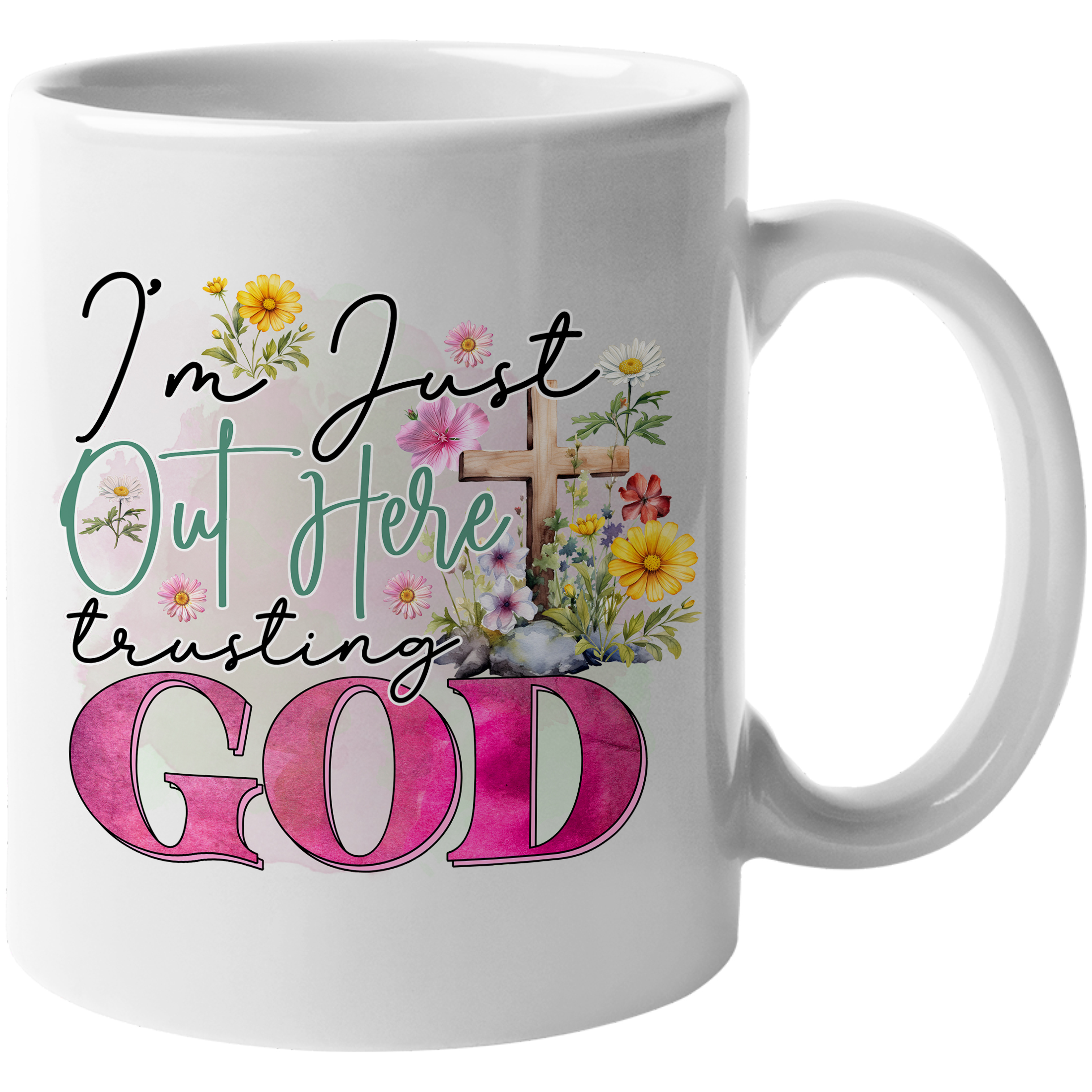 Coffee Mug, I'm Just Out Here Trusting God Quote, Wooden Cross & Flowers Art