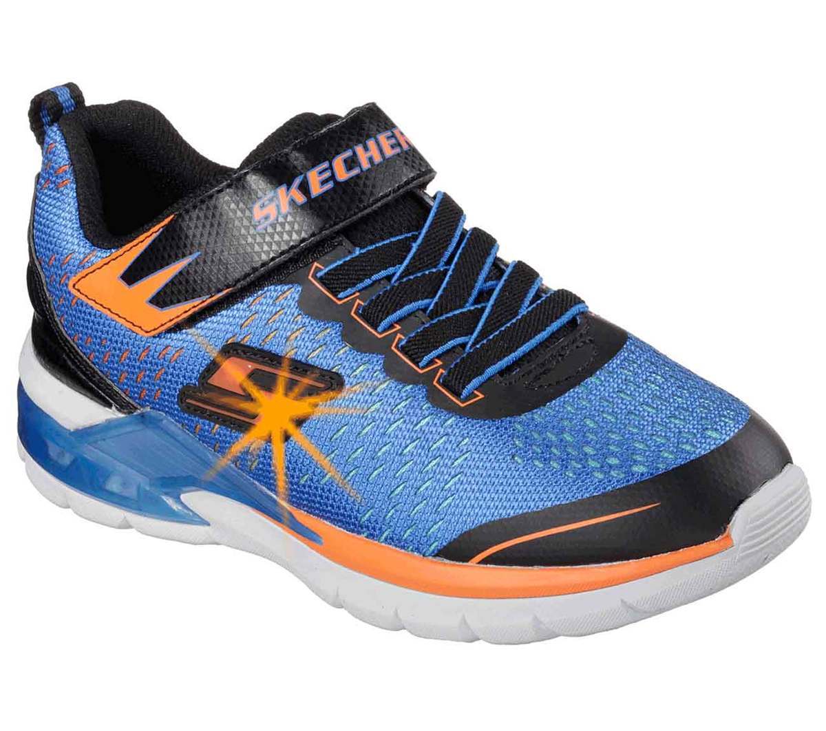 These Skechers Erupters Ii lava Arc boys' trainers in a low-top style are designed with a fun light-up feature. Suitable for boys, the trainers come in a bold BLOR colour (blue and orange). The shoes are size 4 UK and feature the Skechers brand, making them a stylish choice for active young boys.
