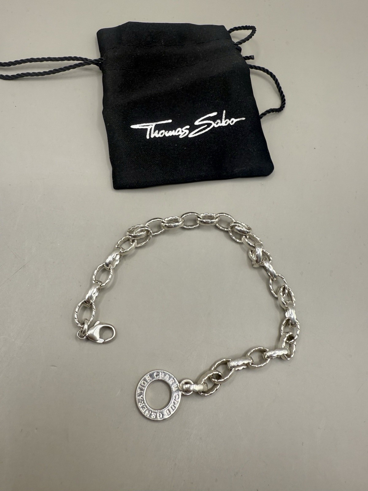 Sterling Silver Clasp and THOMAS SABO Logo Ring. - To be Attached with THOMAS SABO Charms. - Sterling Silver Belcher Chain. Length 18cm. - 0.60cm thick Oval Design.