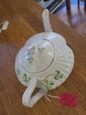 BELLEEK CLASSIC SHAMROCK TEA POT HARP HANDLED BLUE 9th MARK.