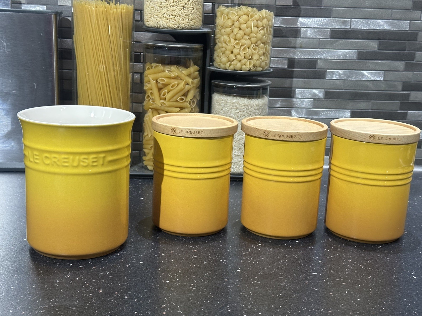 Le Creuset New Ceramic Set Of 3 Nectar Yellow Storage Pots & Utensil Pot RRP£156 Utensil pot - retails for £42 - 14.8cm high - Dishwasher safe - 1L capacity Storage pots - retail for £38 each - 10cm high - Dishwasher safe (Wooden lids hand wash only) - Airtight wooden lids