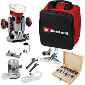 Thanks to the PXC rechargeable battery pack, the Einhell Cordless router/trimmer TP-RO 18 Set Li BL Solo offers the freedom of cordless operation. The speed control electronics have been paired with a powerful brushless motor. The fine/depth adjustment and precise twin-tube guide enable high-precision working. The clamp (6 + 8 mm), spindle lock, and LED lighting combine with the soft grip handle, the chip shield, and the two-handed attachment to make work as comfortable and easy as possible. The plastic insert protects the workpieces. The edge trimmer base allows edges to be beveled. The unit is supplied with a parallel stop, compass tip, a copy sleeve, an assembly tool, an extraction adapter and a storage bag. No battery and charger. Together with a powerful motor, the .
