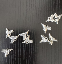 10 Humming Bird Charms. Size:see pictures with penny & ruler (mm). Material: Zinc Alloy (Lead (Pb) & Nickel (Ni) free). Colour: Bright Silver.