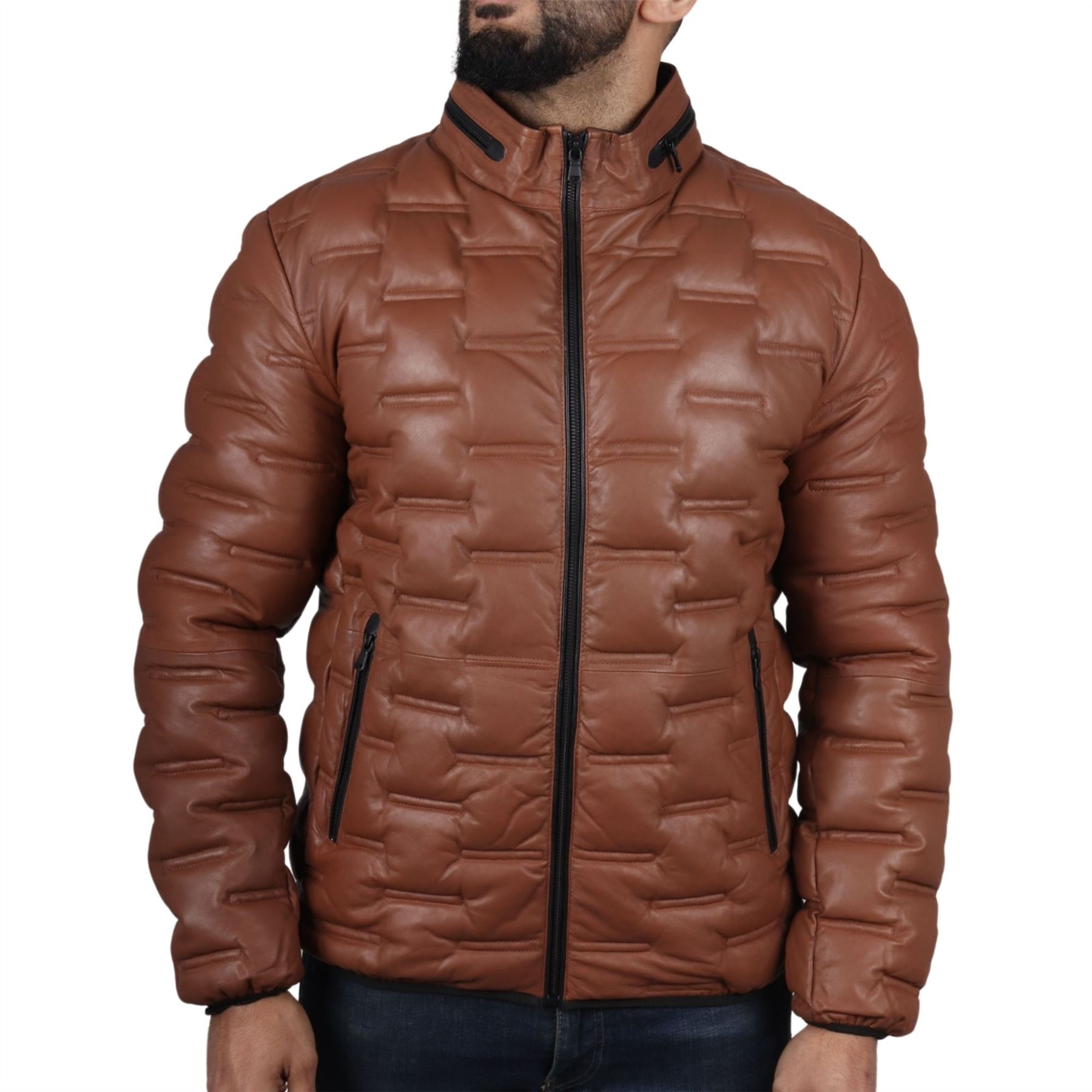 Men's Puffer Quilted Real Leather Waist Length Jacket