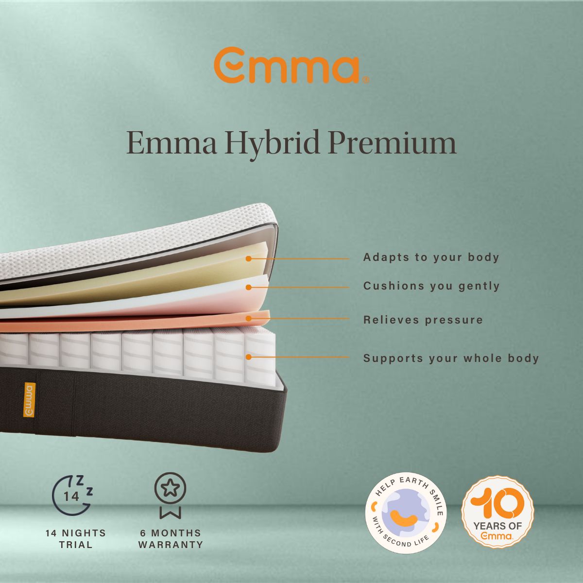 Emma Refurbished Hybrid Premium Mattress – Eco-Friendly Comfort & Award-Winning Design. UltraDry™ Cover: Breathable, removable, and washable – keeping your mattress fresh and hygienic. Quick Setup: Simply unbox, unroll, and let your mattress expand – ready to enjoy in hours.