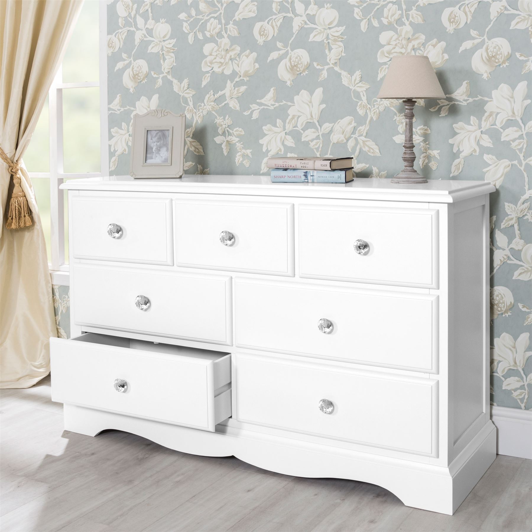 Romance large chest of drawer. 7 drawer dresser with crystal handles.ASSEMBLED