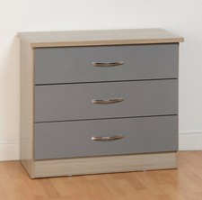 Nevada Grey 3 Drawer Bedside Cabinet. This Nevada range is made from an attractive light grey oak veneer and grey gloss. It is also available in other colours. Light Grey Oak Effect & Grey Gloss. Composite Board, 3D Paint Effect, Plastic Veneer.