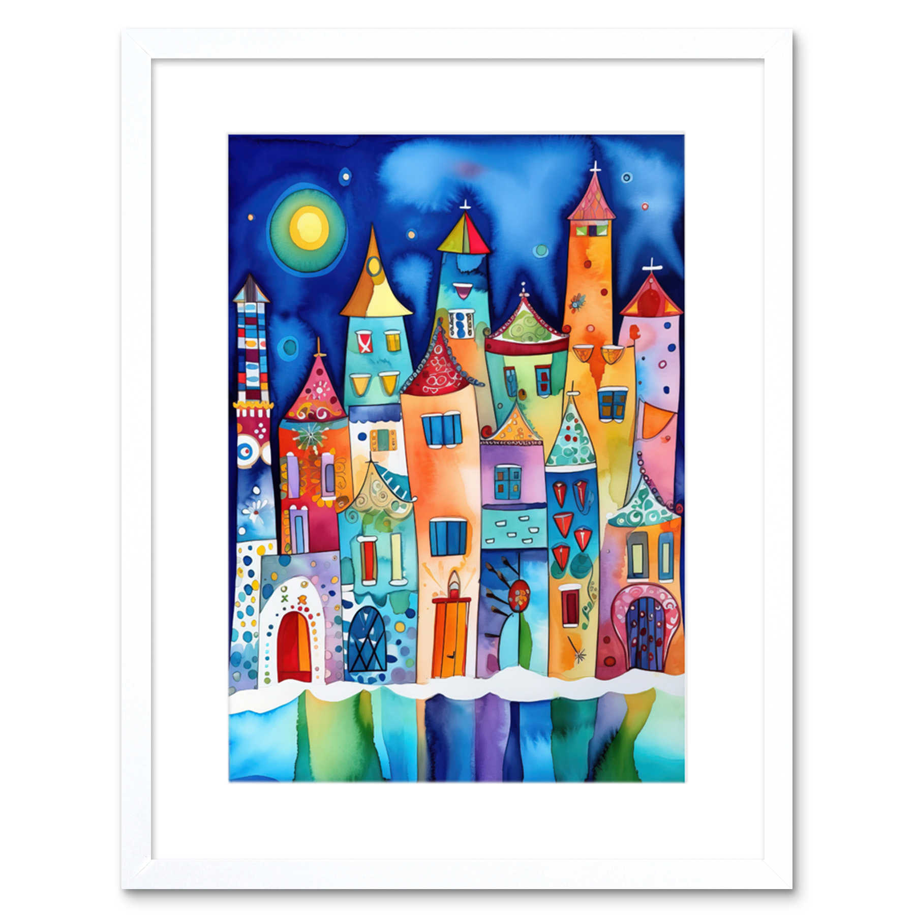 Midnight Abstract Town Modern Folk Art Framed Wall Art Print Picture 9X7 In