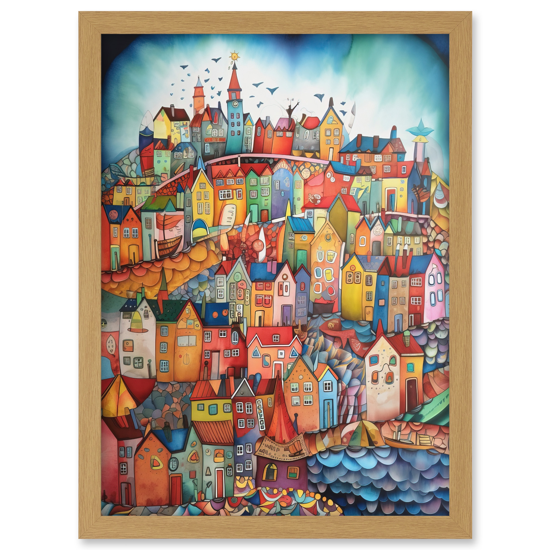 Abstract Fishing Village Modern Folk Art Framed Wall Art Picture Print A3