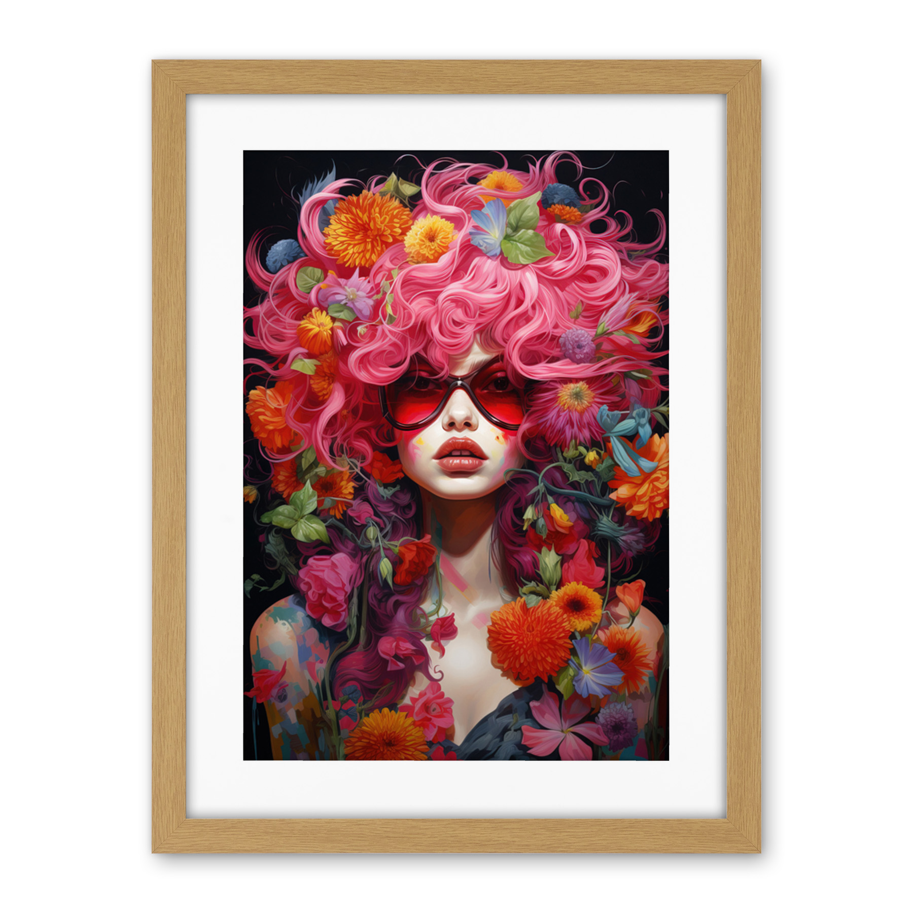 Flowerpunk Woman with Pink Hair and Flowers Vibrant Framed Wall Art Print 18X24