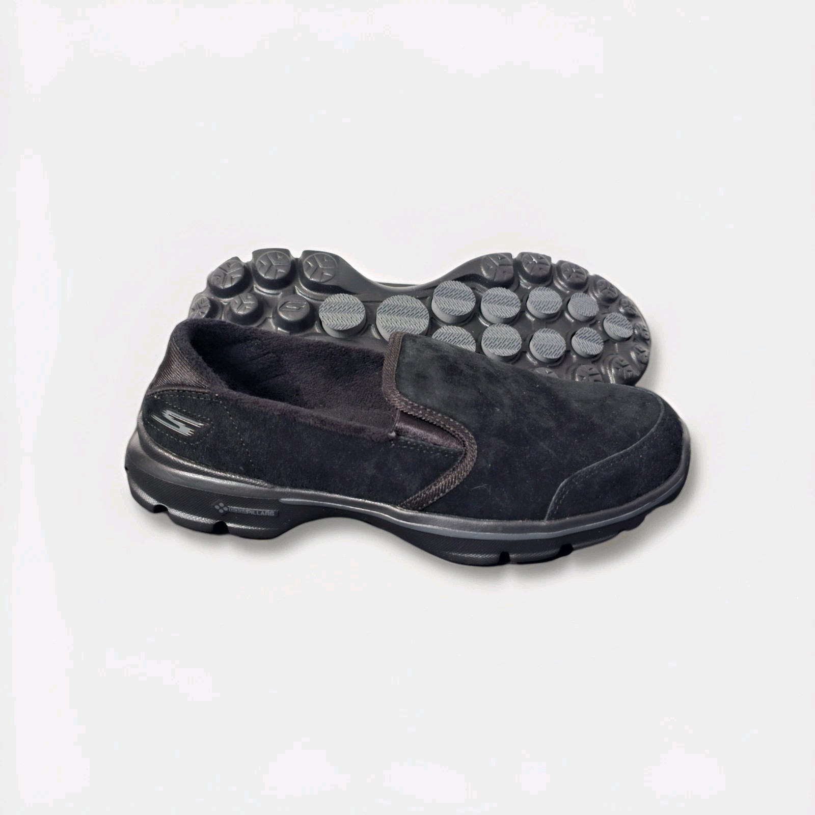 Skechers Go Walk 3 slip-on shoes feature a black suede upper and a flexible rubber outsole. Design: A slip-on technical walking shoe with a suede-like or knit fabric upper. Technology: These shoes incorporate Goga Pillars on the midsole and outsole for shock absorption and Goga Mat® technology in the footbed for high-rebound cushioning. Sole: The outsole is designed with independent circular GOimpulse sensors that offer flexibility and a more responsive walking experience.