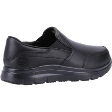 Skechers Black Bronwood Slip Resistant Slip-On Men's Work Shoes UK 8 • Brand: Skechers • Size: UK 8 • Condition: Brand new without tags • Colour: Black • Material: Leather and synthetic upper • Sole: Slip-resistant rubber traction outsole • Features: Relaxed Fit design and Memory Foam insole These work shoes are constructed with a durable leather upper and feature elasticated side panels for a flexible slip-on fit. The design includes a roomier Relaxed Fit toe area and a cushioned Memory Foam insole to support the foot during long periods of wear. The slip-resistant outsole is specifically tested for grip on oily and wet surfaces, ensuring reliable traction for professional safety requirements.