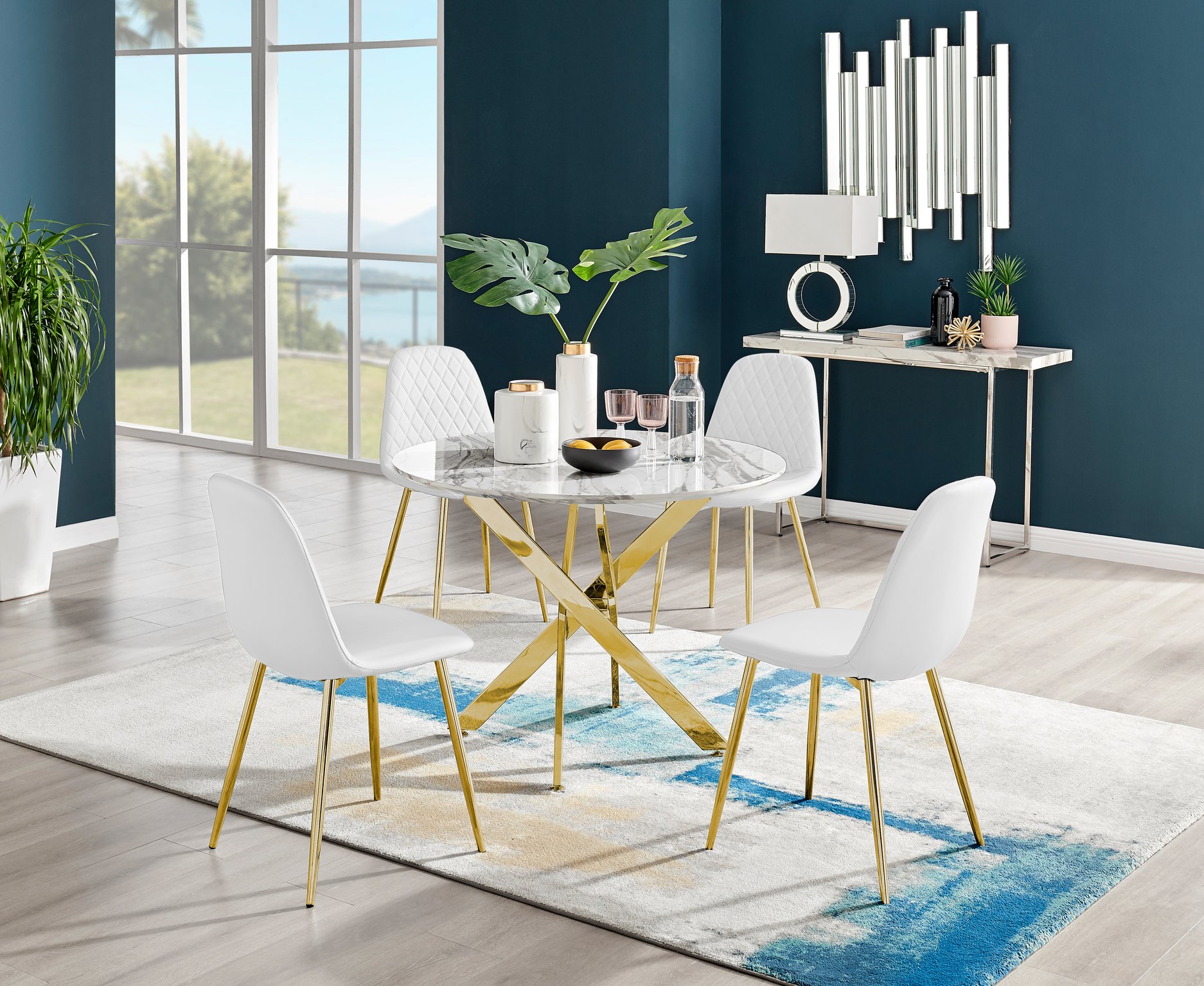 Novara White Marble Gold Leg Round Dining Table 100cm & 4 Corona Chairs Set