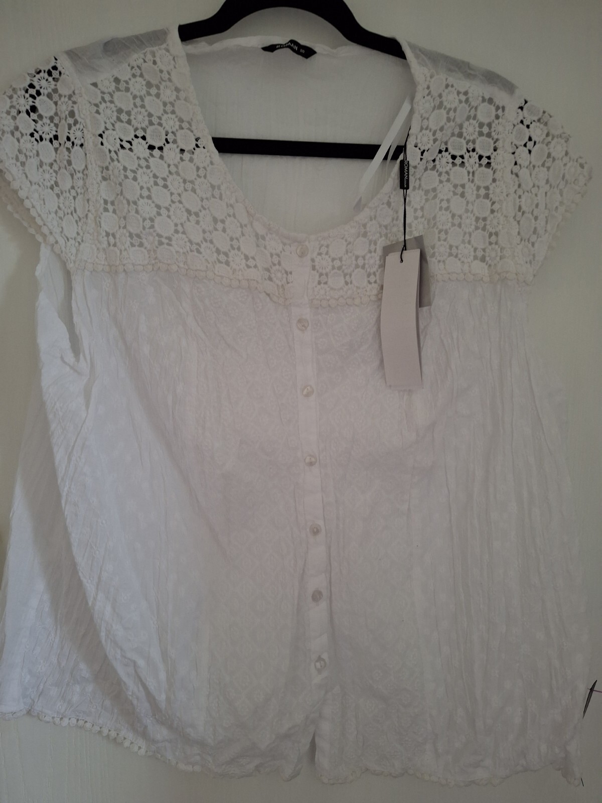 Elevate your wardrobe with this stunning white lace yoke and sleeve crinkle blouse from Roman. Perfect for any occasion, whether it's travel, casual wear, work or business, this blouse is made from 100% cotton and is machine washable for easy care. The lace cap sleeve and lace accents add a touch of elegance to the round neckline and button closure. Pit to pit 46, length 25 inches. This blouse comes in a regular fit and is available in size 20. The blouse is perfect for the autumn, summer and spring seasons. With its beautiful white colour and flower detail, this blouse is a must-have for any woman's wardrobe.