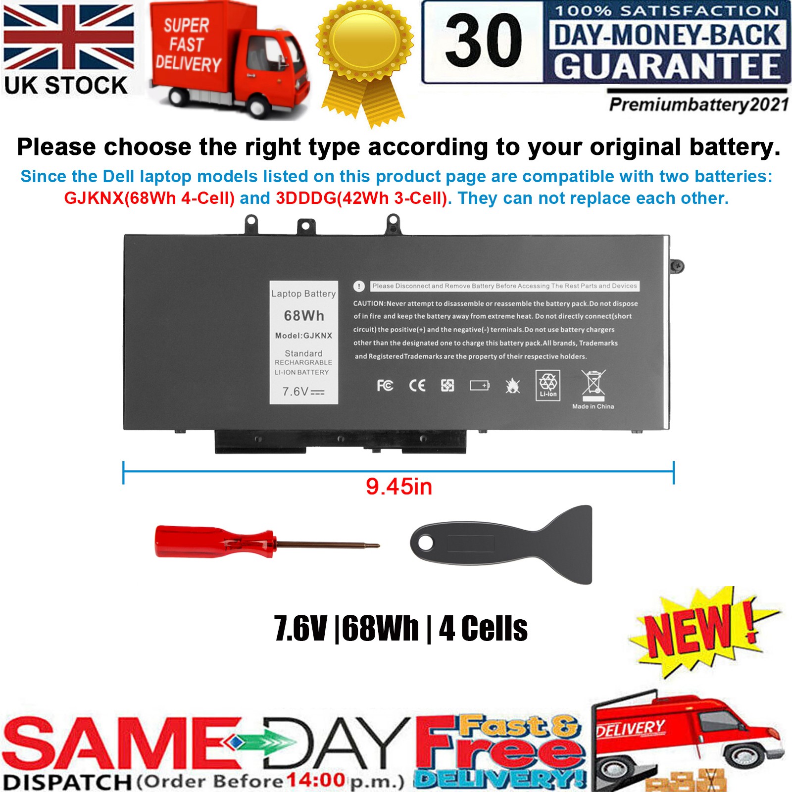 Important Note: There are 4 types' compatible battery, VG93N(92wh), GJKNX(68wh), 93FTF(51wh) and 3DDDG(42wh). Please choose the RIGHT battery model and capacity according to your laptop's original battery. Select 1: 4 Cells 7.6V-68Wh Battey-(Long Size) Specifications: Battery Type: Li-ion Voltage: 7.6V Capacity: 68Wh(Long Size) Cell: 4-Cell Certificate: CE,RoHS,FCC Condition: 100% New from Manufacturer, Grade A Cell Replace Part Number: GJKNX, GD1JP, 0GD1JP, DY9NT, 0DY9NT, 5YHR4, 451-BBZG. Selected 2: 3 Cells 11.4V-42Wh Battey-(Short Size) Specification: Battery type: Li-ion Voltage:11.4V Capacity: 42Wh(Short Size) Cells:3cell Compatible Part Number 3DDDG 3VC9Y 03VC9Y O3VC9Y 45N3J 80JT9 049XH 451-BBZP. .