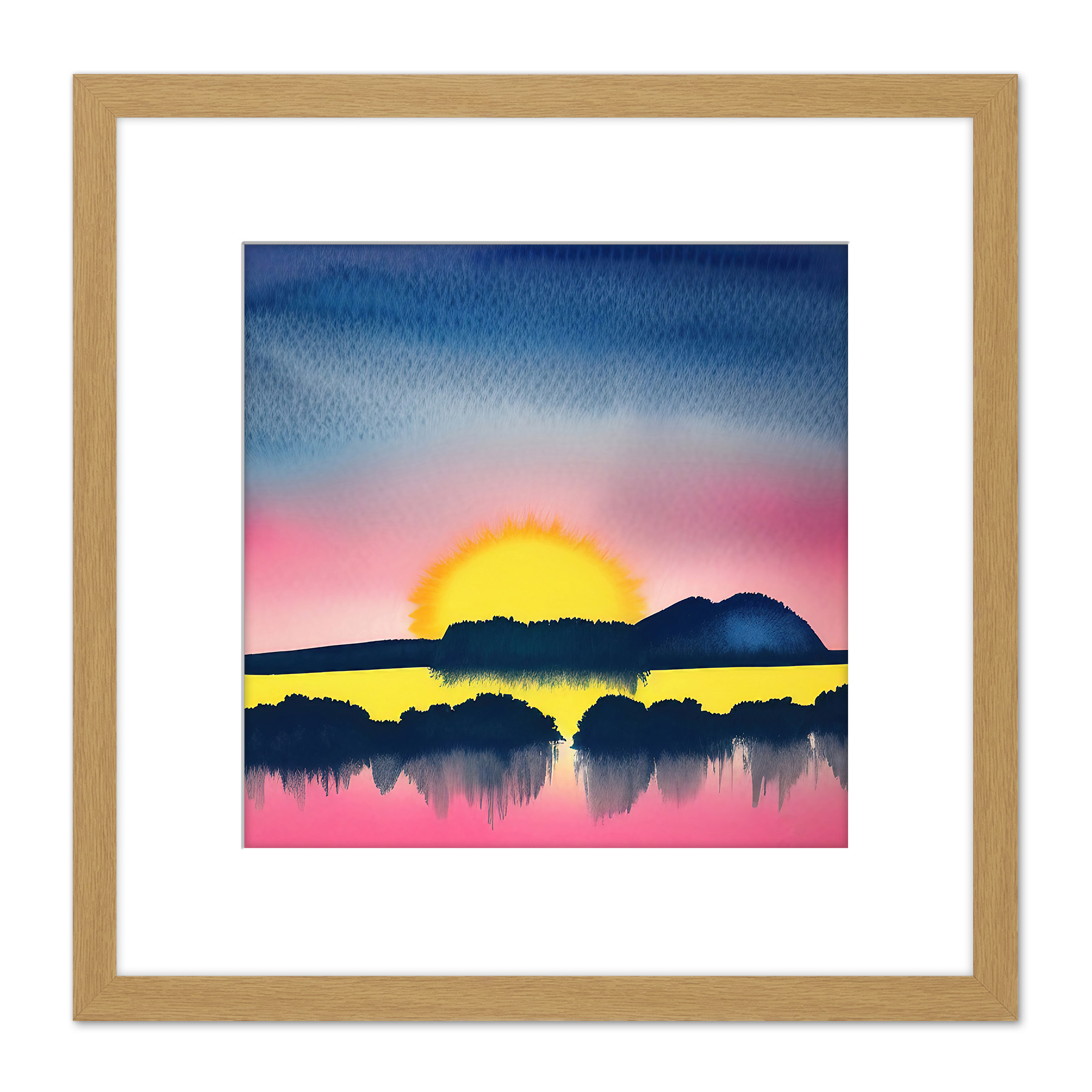Sunset Winter Sky Hill Pink Watercolour Square Framed Wall Art Print 8X8 In