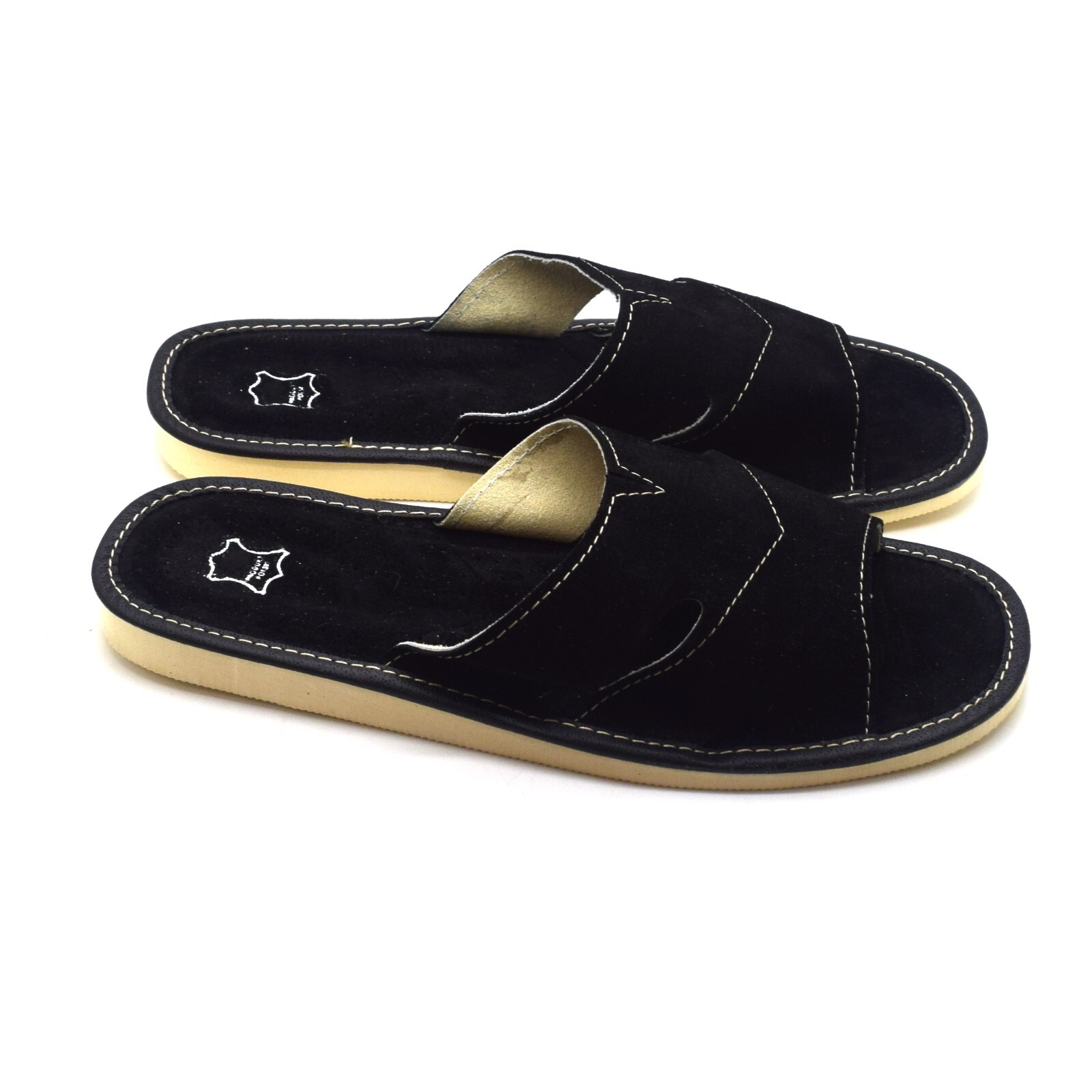 Mens Genuine 100% Suede Leather Slippers Natural Leather Open Toe Black NEW