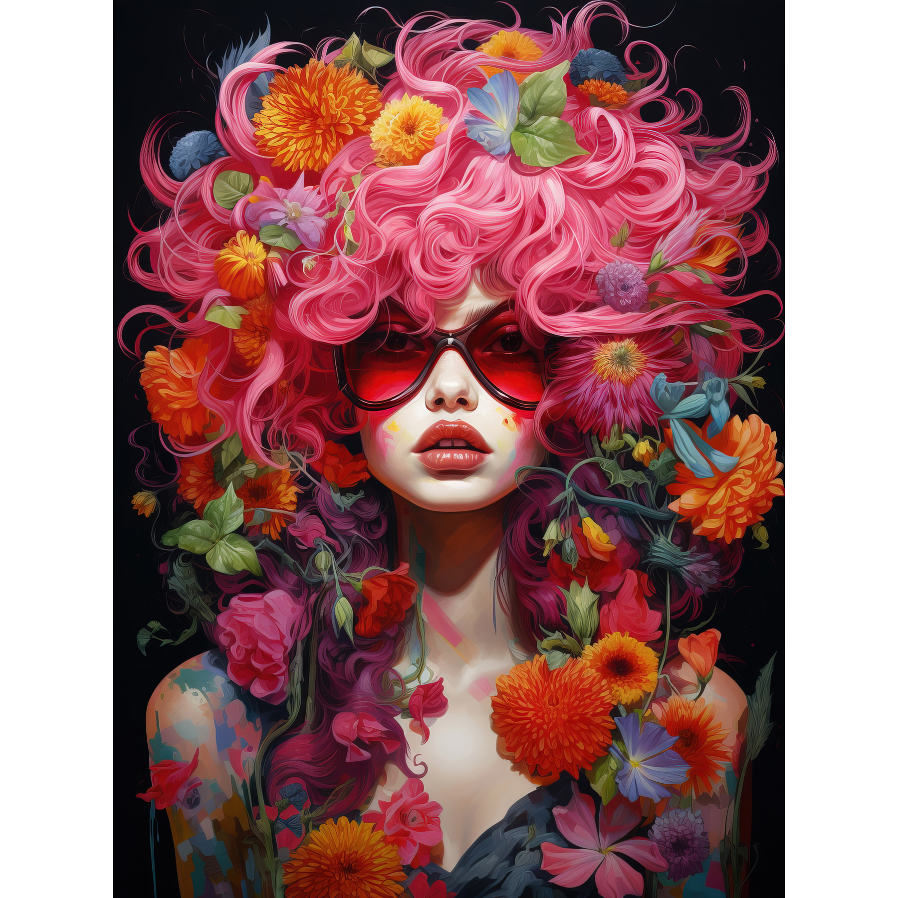 Flowerpunk Woman with Pink Hair and Flowers Vibrant Framed Art Picture 12x16