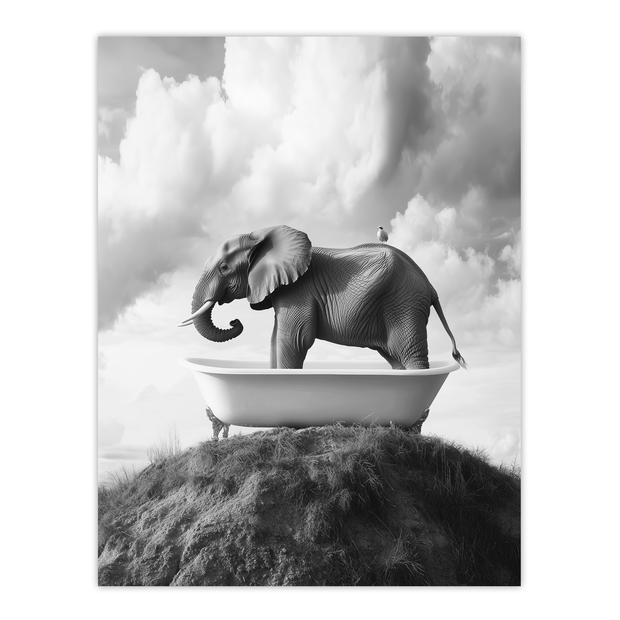 Elephant in Bathtub on a Hill Black White Surreal Wall Art Poster Print