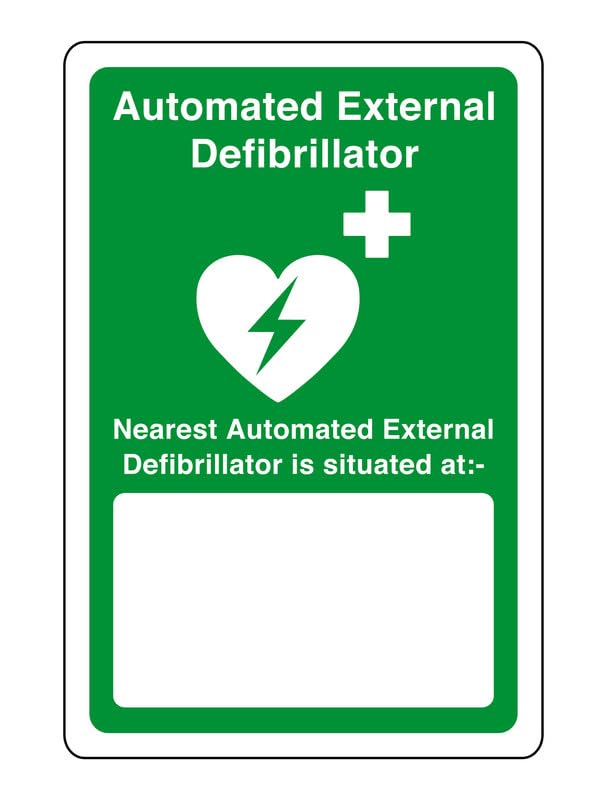 AED Safety sign - Automated external defibrillator is situated at emergency sign- Available in 3 Material Types: PVC Plastic, High-Tack Sticker, and Aluminum Dibond (Metal Sign).