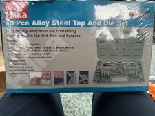 High quality alloy steel set containing popular metric tap, dies and holders. Suitable for cleaning, cutting new or chasing lightly damaged threads. In convenient heavy duty steel box for safe storage. Taper, plug and bottoming taps for precise use. Sizes: M3, M4, M5, M6, M8, M10 and M12. Contains: 7x dies, 7x taper taps, 7x plug taps, 7x bottom taps, 1x die handle, 1x tap wrench, 1x screwdriver, 1x screw pitch gauge.