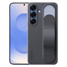 The Official Genuine Samsung Galaxy S25+ Standing Grip Case Cover in black is designed specifically for Samsung Galaxy S25+ smartphones. Made from rigid plastic with a matt finish, this case features a kickstand for hands-free viewing and a non-slip grip for added security. The lightweight design and included strap make it easy to carry and use on the go. Compatible with Qi wireless charging, this unit is a must-have accessory for protecting your Samsung device in style.