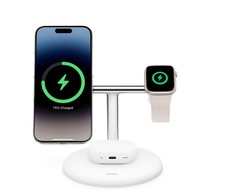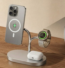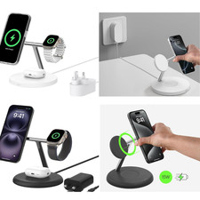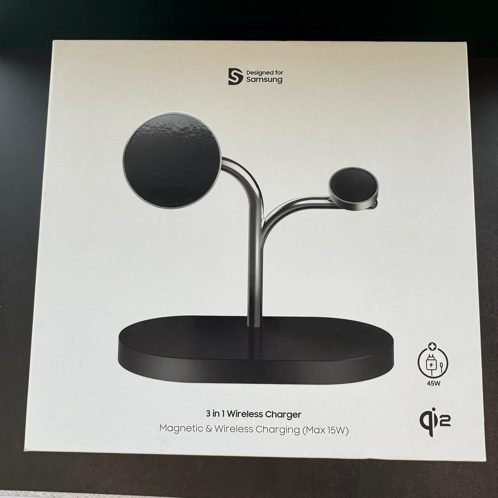 The Samsung 3-in-1 Magnet Qi2 Wireless Charger is designed for use with a range of Samsung devices including Galaxy Z Series foldables, Samsung Galaxy Buds, and Galaxy Watches. The charger comes in a sleek black colour and includes a 45W UK charger, charging cable, and quick start guide. It features a magnetic mount for easy connection and supports wireless charging using the Qi2 and magnetic standards. The charger is versatile, suitable for a variety of Samsung devices, and offers a luxurious design finish on the desktop. It is a convenient and efficient charging solution for Samsung users.