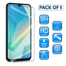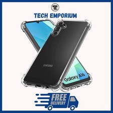 The product is a clear phone cover and screen protector designed for various Samsung models, including the A17, A16, A26, A36, A56, A55, and A35. The fitted case/skin is made of silicone, gel, and rubber material, providing protection with a glossy, transparent finish.