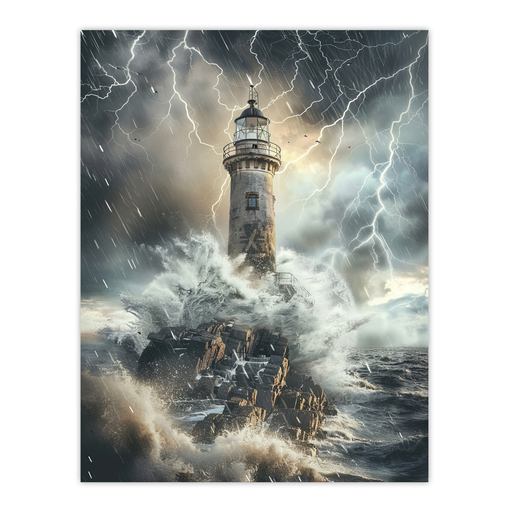 Lighthouse Thunderstorm Sea Crushing Waves Wall Art Poster Print