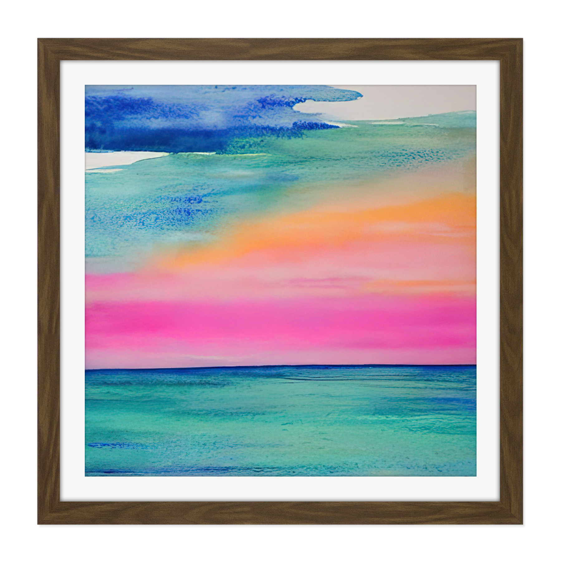 Pink And Orange Seascape Watercolour Sea Square Framed Wall Art Picture Print