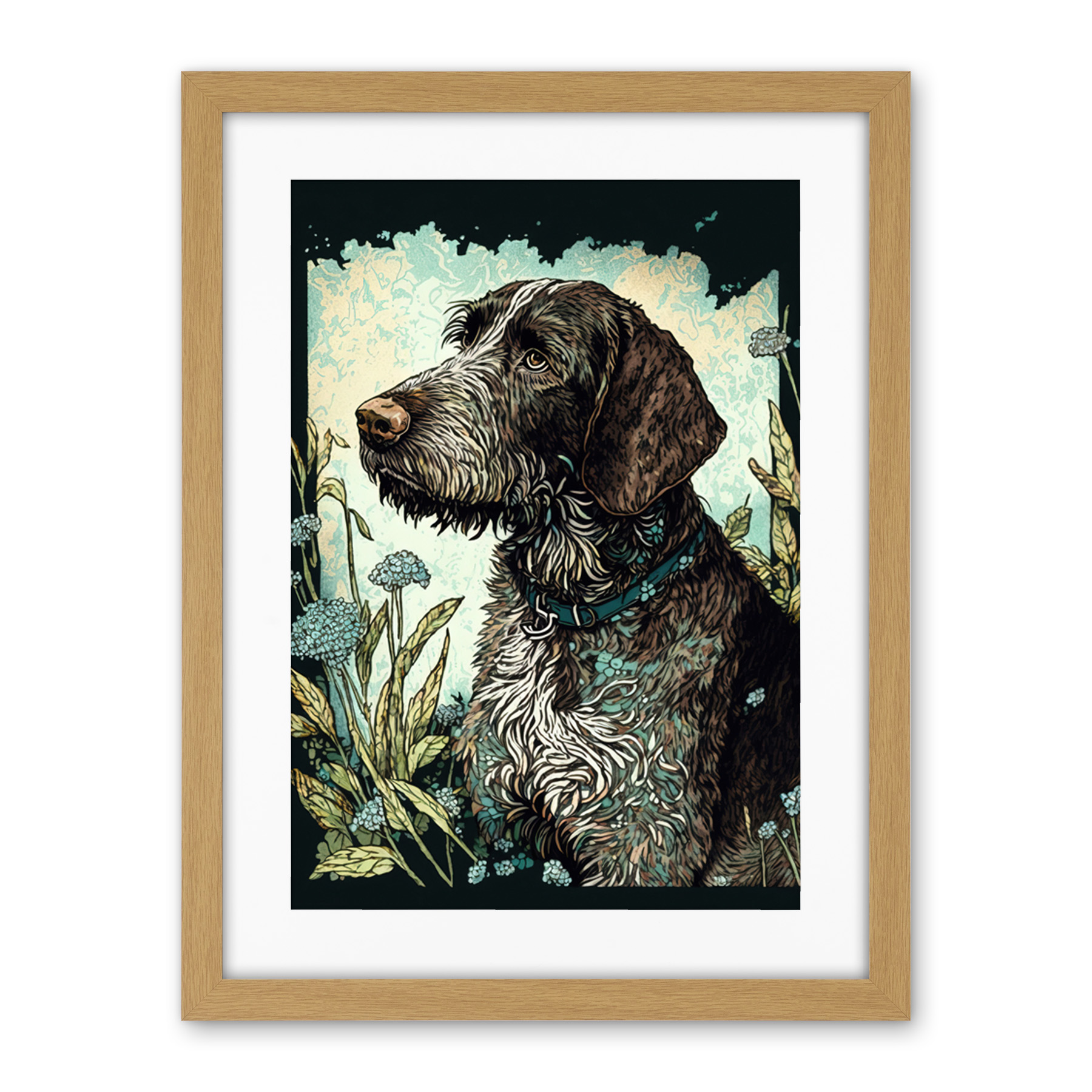 German Wirehead Pointer Dog Wildflowers Framed Wall Art Print Picture 18X24