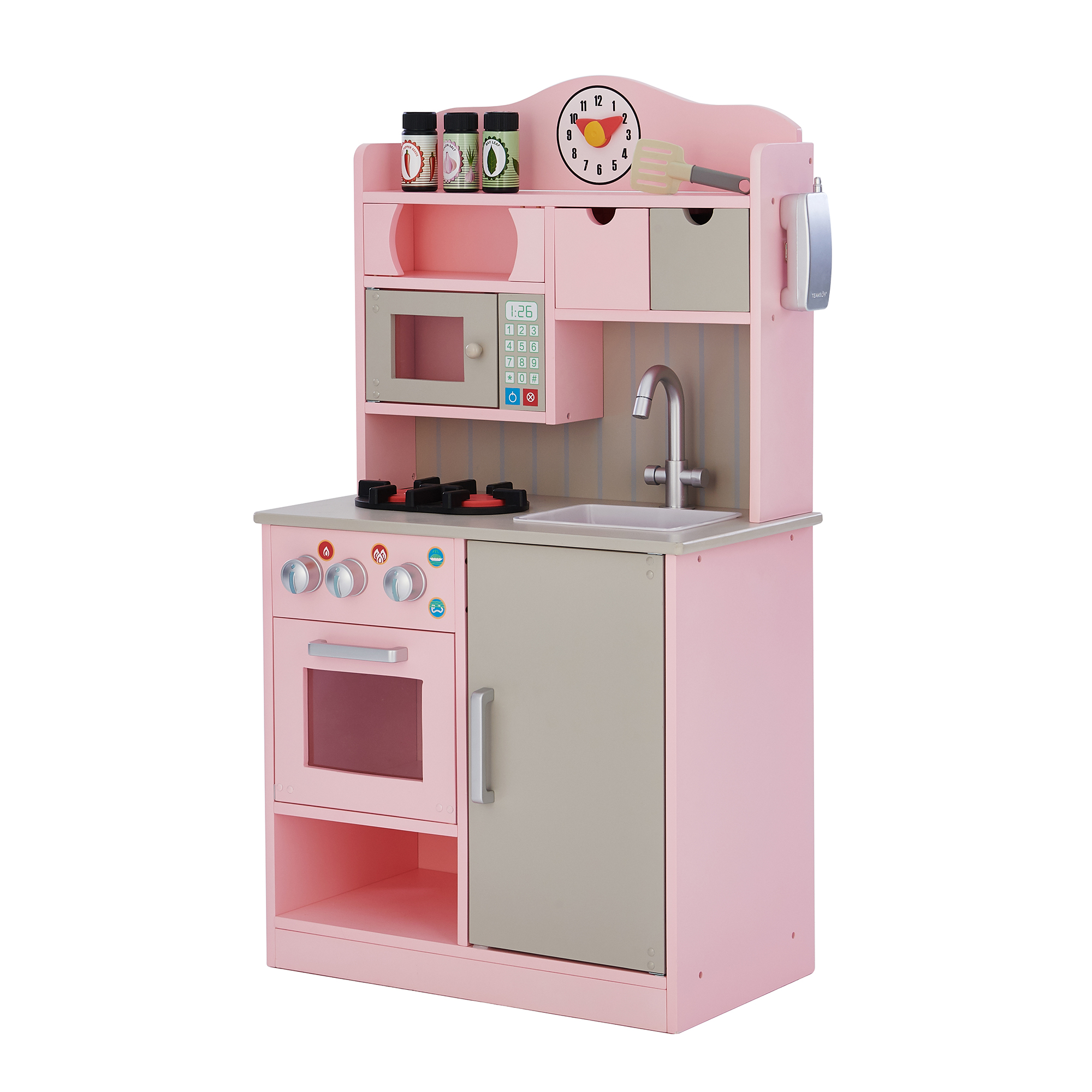 Teamson Kids Little Chef Florence Classic Play Kitchen is a stylish and functional wooden play kitchen with a bright pink finish and neutral gray accents. Interactive features, such as oven knobs that turn and make a clicking noise, or doors that open, help spark imagination in pretend play. Includes a trio of play spice shakers, a spatula, and a cordless play phone. Plenty of storage throughout and its compact size makes it ideal for smaller play areas.