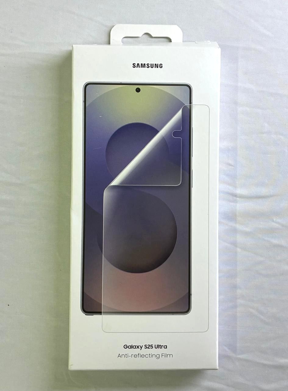 Compatibility: Samsung Galaxy S25 Ultra. Samsung anti-reflecting film screen protector. Type: Anti-reflecting film screen protector. Material: Protective film. Coverage: Full screen coverage. Features: Anti-reflection, glare reduction, clear display.