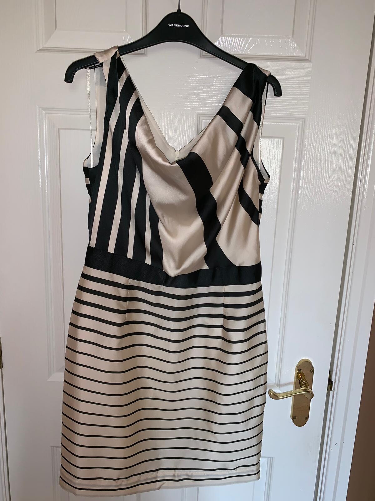 *WORN ONCE* OASIS Black/Cream Silk Knee Length Striped Dress Size 12. Excellent condition. Worn once to my graduation. A very special dress! Flattering look. Suitable for formal/ special occasion wear. Flow silk like material, requires minimal ironing.
