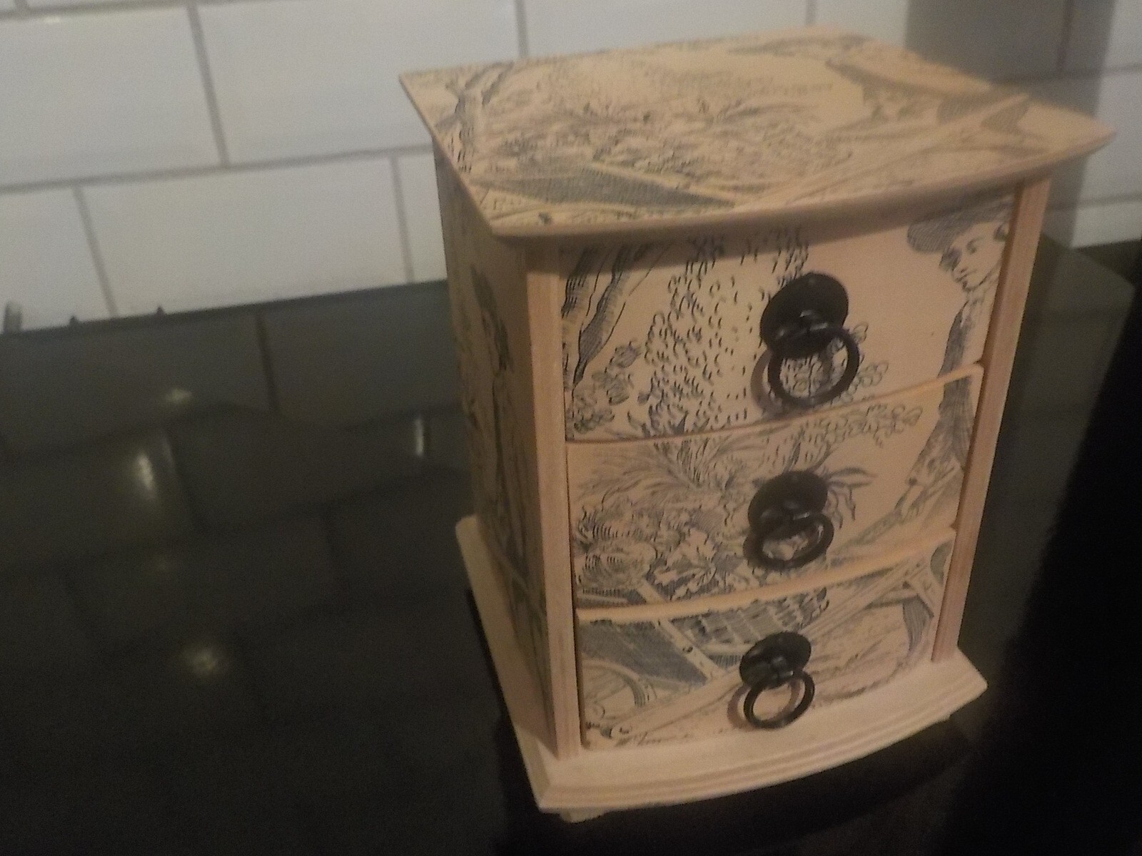 VINTAGE WOODEN MINI CHEST DRAWERS JEWELLERY TRINKET ENGRAVED GARDENING SCENE (G)