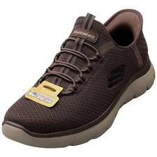 Skechers Slip-Ins Summits Vegan trainers embody effortless style and enduring comfort. Crafted with a sleek black textile upper these shoes offer a modern casual look perfect for everyday wear. The breathable textile lining and cushioned textile insole work together to provide a supremely comfortable feel while the durable black rubber sole ensures reliable traction and long-lasting wear. Designed for men these trainers combine the convenience of slip-on design with a secure lace-up fastening offering a versatile and easy-to-wear option for any occasion.