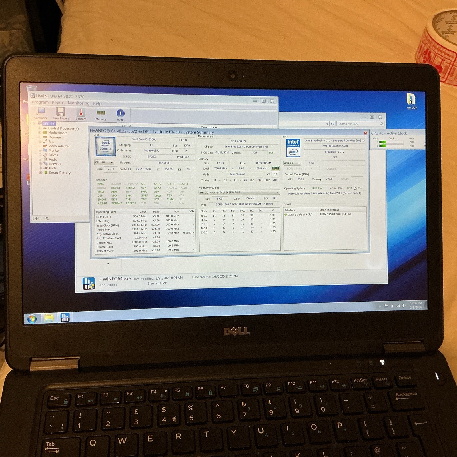 The battery runs with up to 3/4 hours as the battery cell still works. Plus, no AC adapter included. Update: It has 2 small broken bits of the screen, as it might be used for temporary period. The Dell Latitude E7250 is a sleek black notebook/laptop featuring an Intel Core i5-5300U processor with a speed of 2.3 GHz and 8GB DDR3 RAM. It boasts a 12.5-inch LCD with a maximum resolution of 1366 x 768, Intel HD Graphics 5500 GPU, and 128GB SSD storage. This laptop is equipped with features such as Bluetooth, built-in webcam, built-in microphone, and Wi-Fi connectivity. It runs on Windows 10 Pro operating system and is ideal for users looking for a reliable and efficient portable computer for work or personal use.