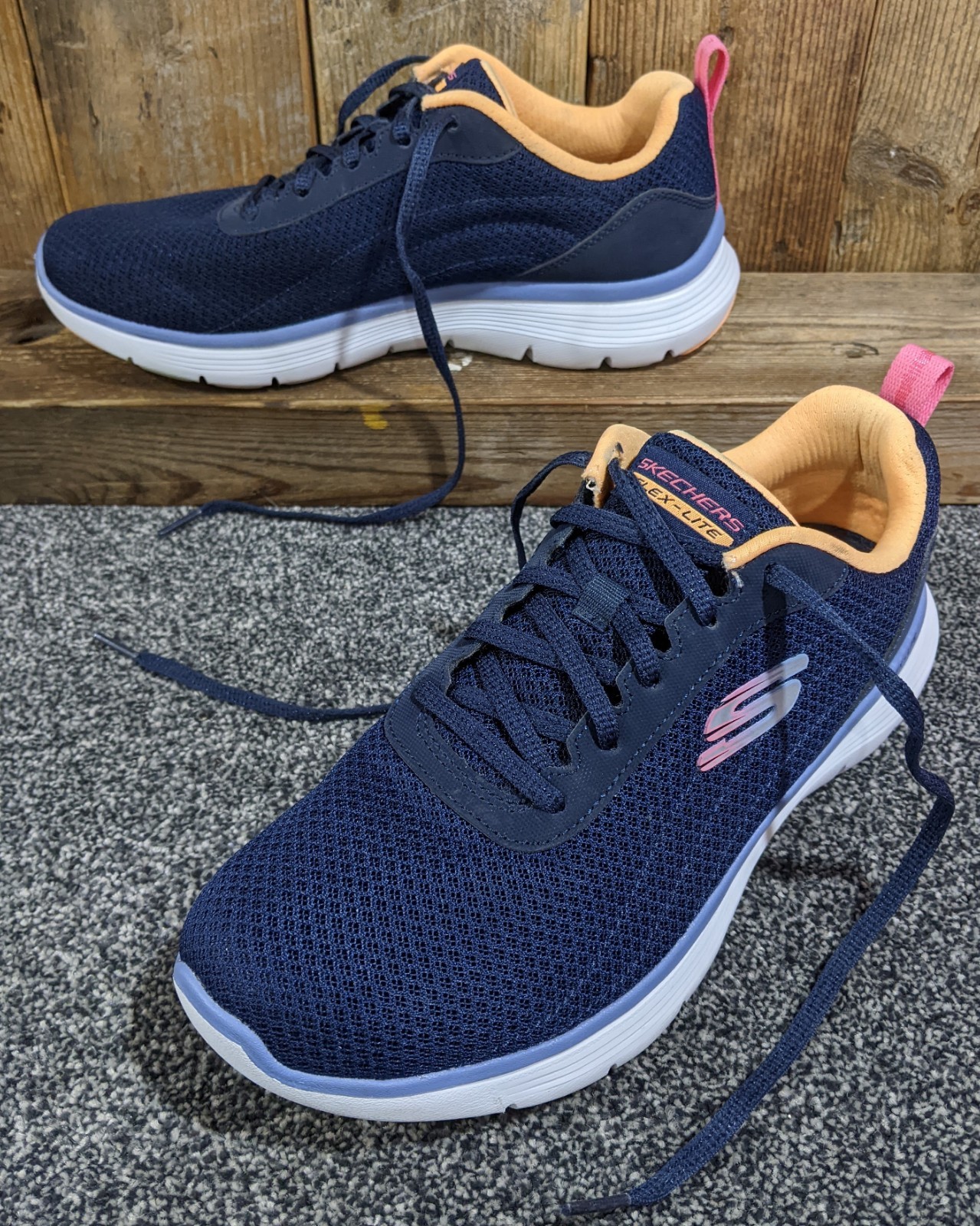 Model: Flex Appeal 5.0 - New Thrive (Style #150200 NVMT). Size: UK 5.5 / US 8.5 / EU 38.5. Colour: Navy / Multi with Coral/Peach lining and Pink accents. Sustainability: 100% Vegan materials andMachine Washable.