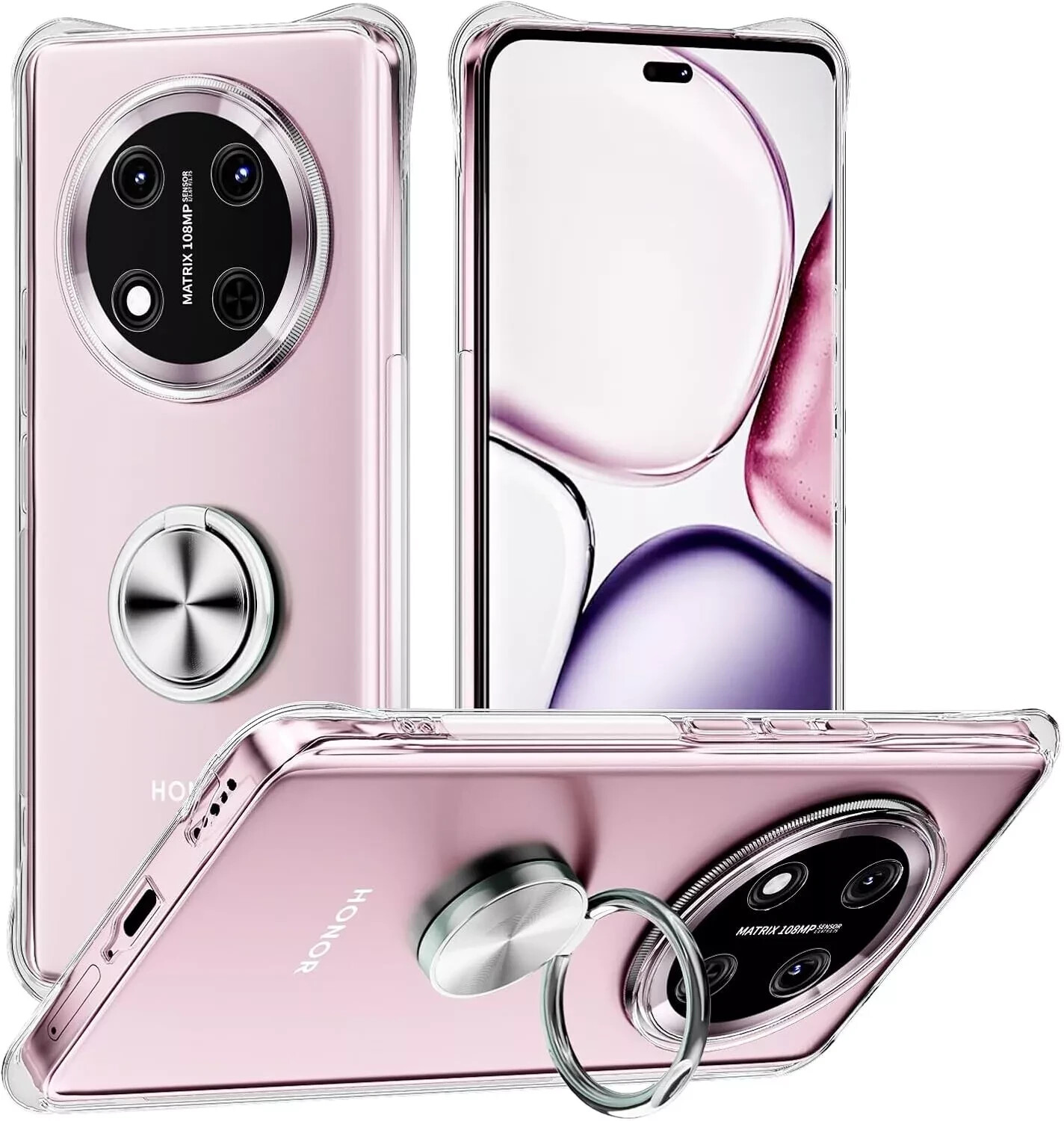 This clear shockproof ring gel phone cover is designed for the Honor Magic 7 Lite / Pro. The case features a built-in ring holder for added convenience and a kickstand for hands-free viewing.