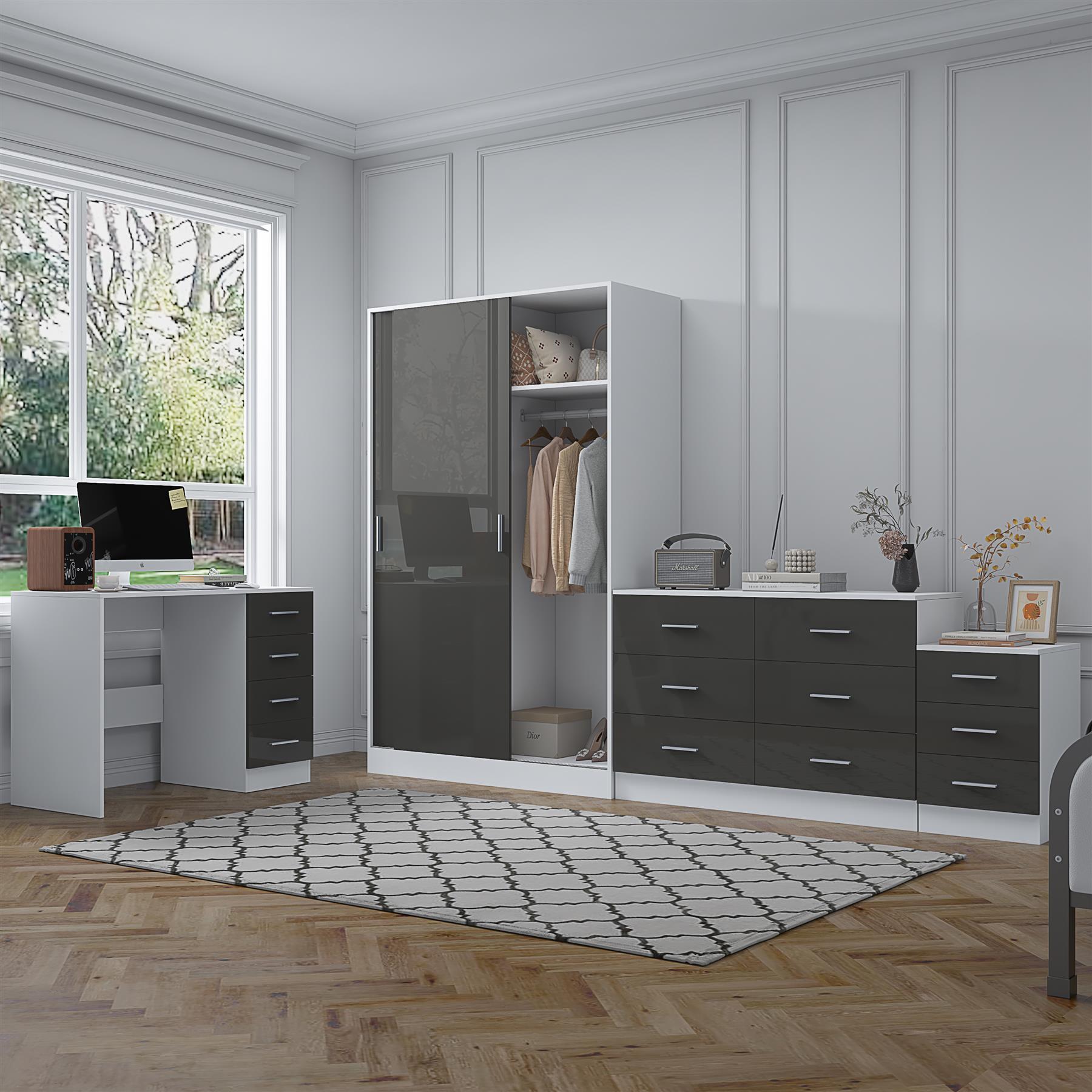 REFLECT Bedroom Furniture Set - Sliding Wardrobe + 6 Drawer Chest + 3 Drawer Bedside + 4 Drawer Desk. REFLECT blends modern design and practical storage with this elegant bedroom set. Featuring a spaciousSliding Wardrobe, a large6 Drawer Chest ,3 Drawer Bedside and a4 Drawer Desk unit, all finished in a sleek high gloss for a contemporary style.