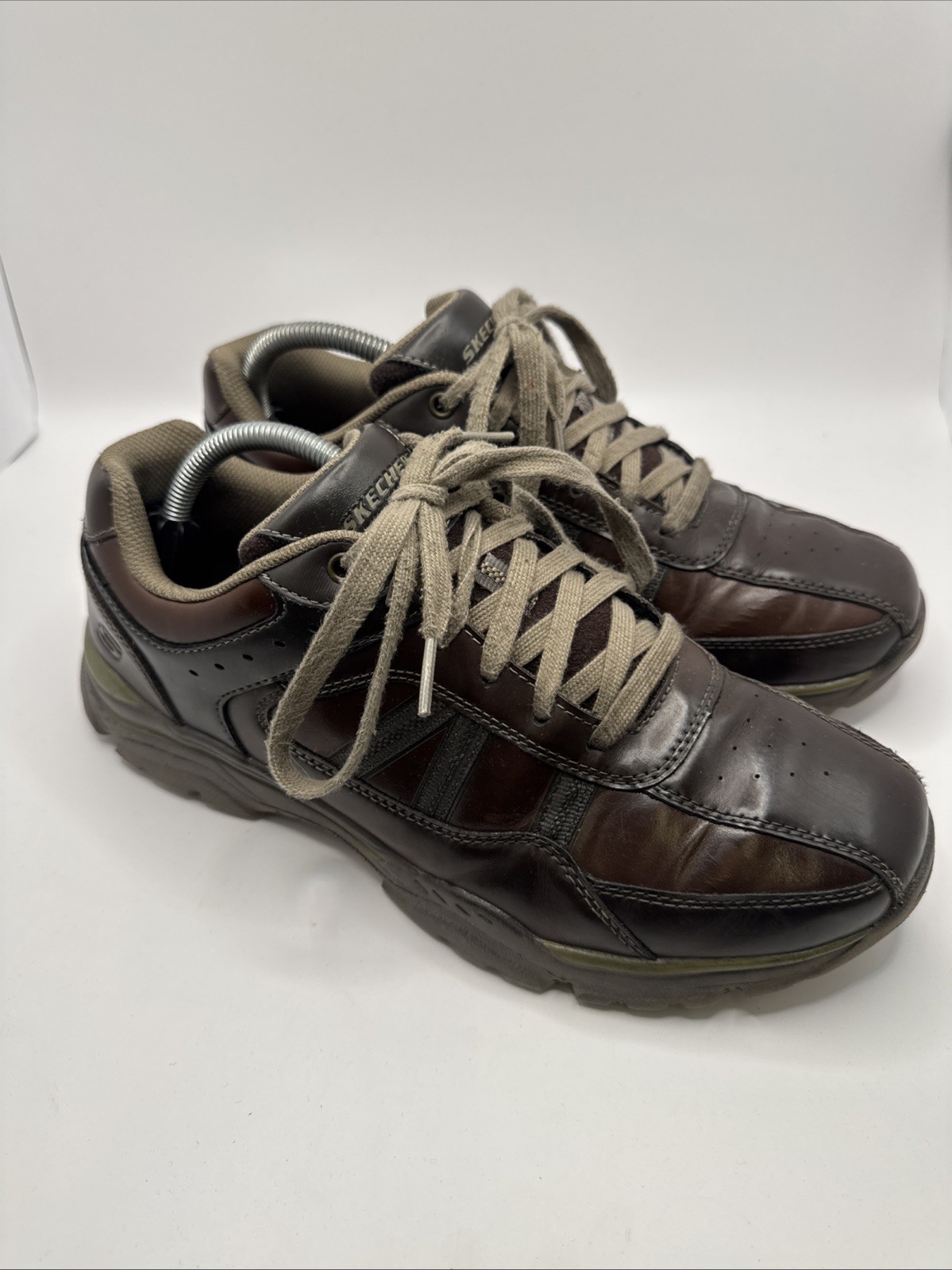 The Skechers Air-cooled Memory Foam Brown Leather Shoes in Men's UK size 8 offer a comfortable and stylish option for casual wear. With a premium leather upper and Skechers' Memory Foam technology, these sneakers provide both durability and support for all-day wear. The brown colour adds a classic touch, making them versatile for various casual outfits. Perfect for men looking for a combination of quality, style, and comfort in their footwear choice.