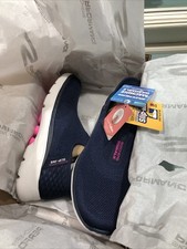 The Women's Skechers Go Walk Flex Grand Entry Sneakers in size 9M, navy/blue color scheme, are a stylish and comfortable choice for various occasions including activewear, casual wear, and workwear. Featuring a slip-on closure and made with cushioned memory foam material, these sneakers provide a cushioned and comfortable fit for walking and other athletic activities. The mesh fabric upper and rubber outsole offer durability and breathability, making them a versatile option for all seasons. Perfect for those looking for a blend of athleisure and sports-themed footwear, these Skechers sneakers combine fashion and functionality.