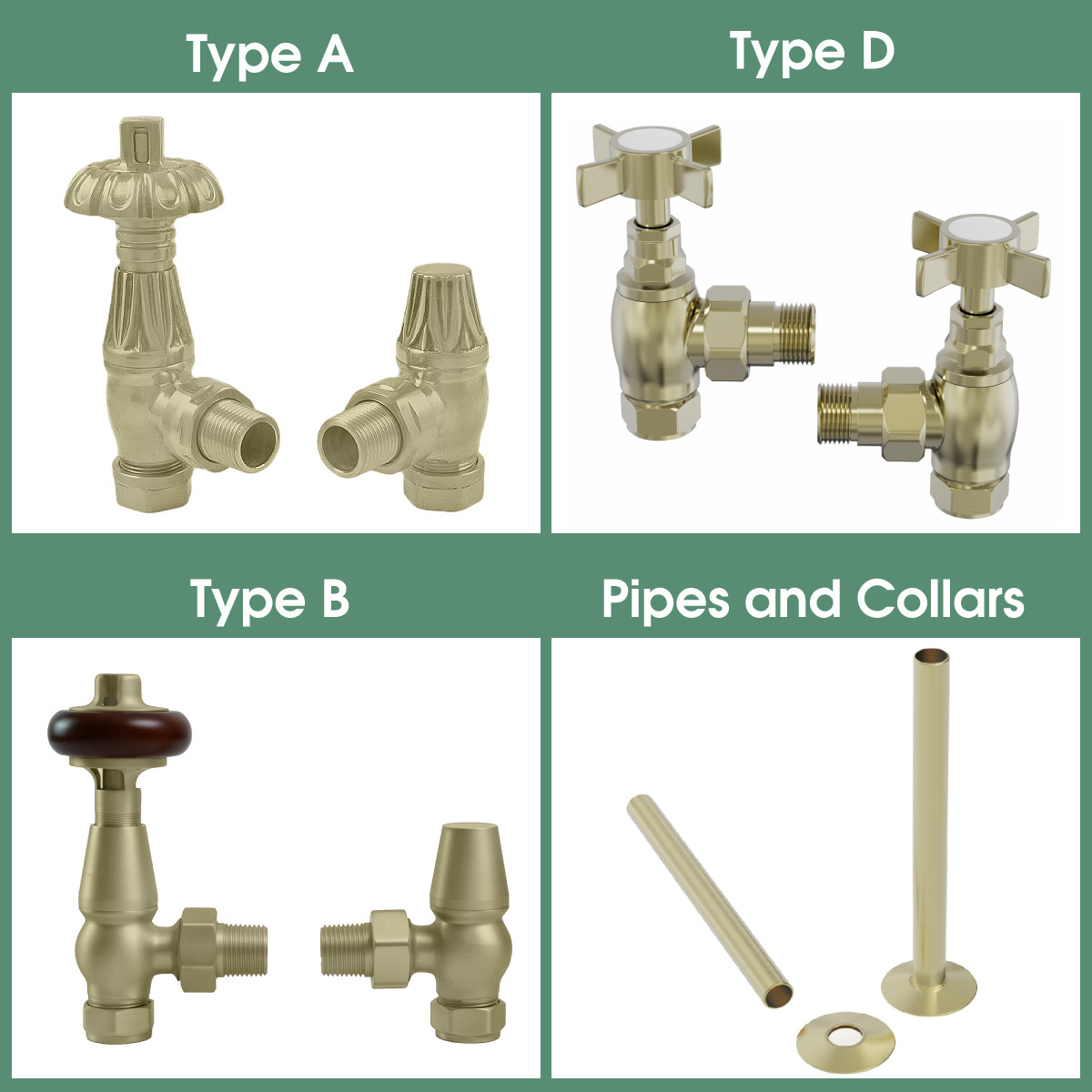 Valve Type: Thermostatic. Style: Angled. Pipes and Collars. Set Includes: Pipes & Collars One Pair. Flat Panel Radiator. Type A & B Valves. A pair of Traditional Cross Head Manual Valves. Oval Radiator.