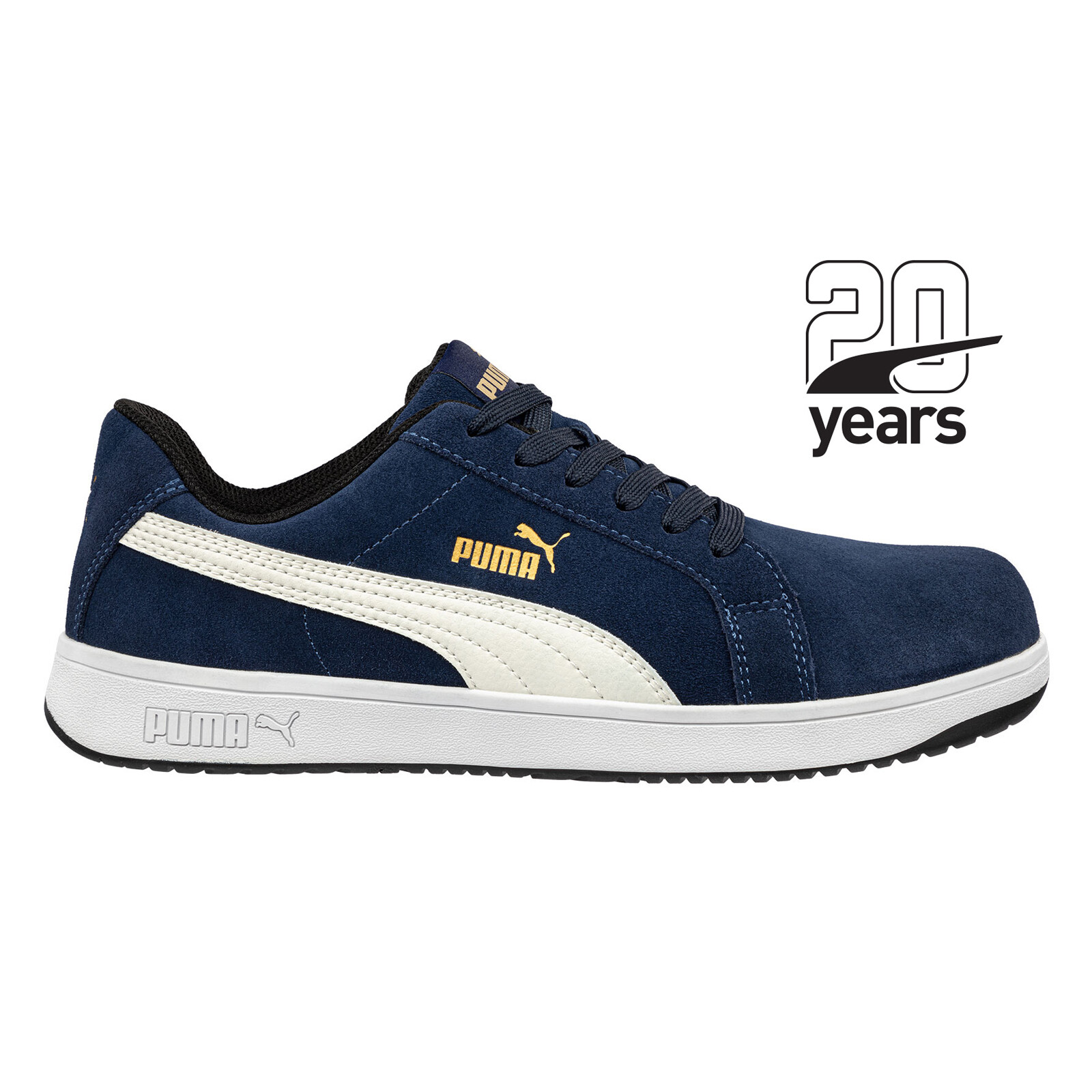 This is really a safety shoe?. Of course it is! The new ICONIC from PUMA Safety, inspired by classic sports shoes, not only looks good, but also shines with its sophisticated features! A rotation point incorporated into the sole in the midfoot area minimises friction and fatigue.