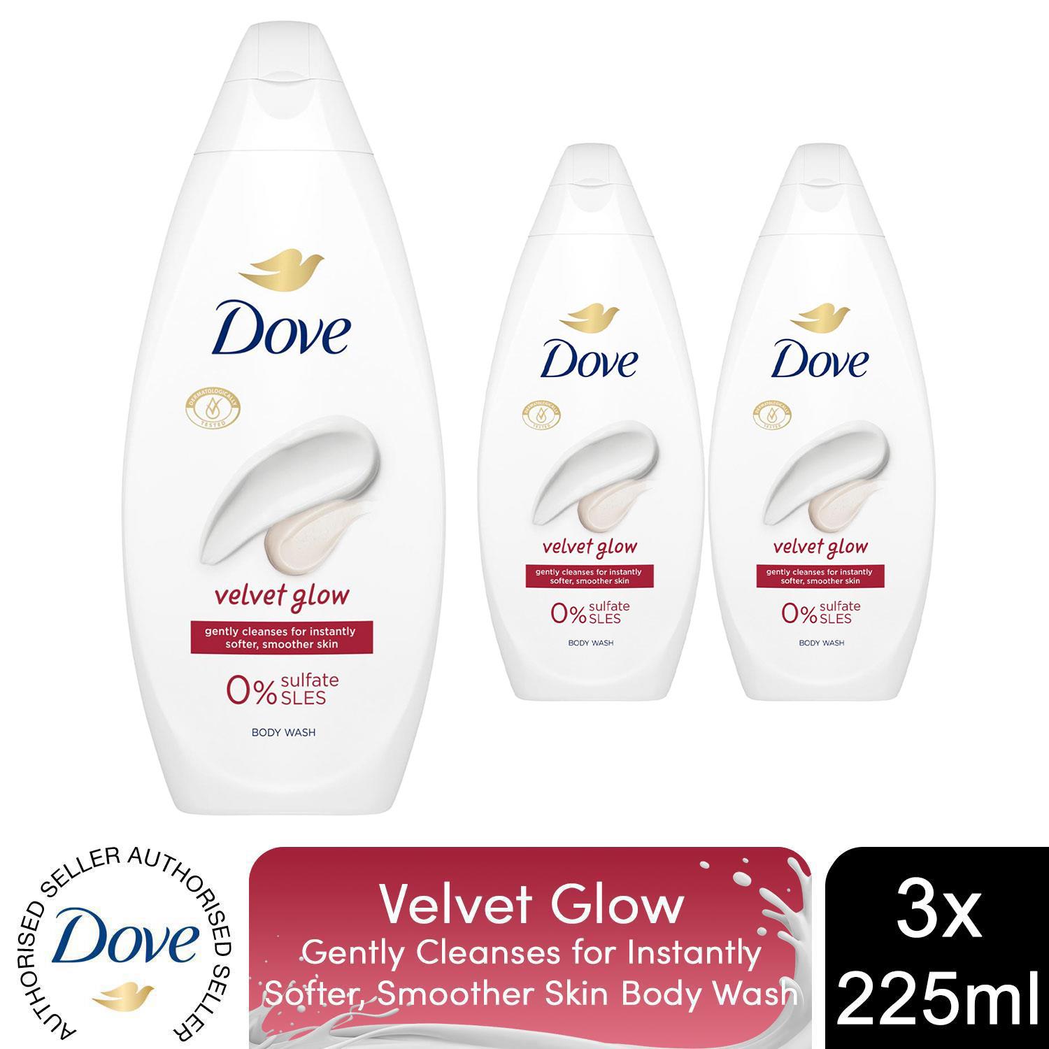 Box Contains: 3x Dove Body Wash Hydrate, Fruity Nourish or Velvet Glow, 225ml (Select your type from dropdown). Developed with 100% gentle cleansers, this mild and nourishing body wash works to cleanse and nourish skin, leaving it softer and smoother in just one shower.