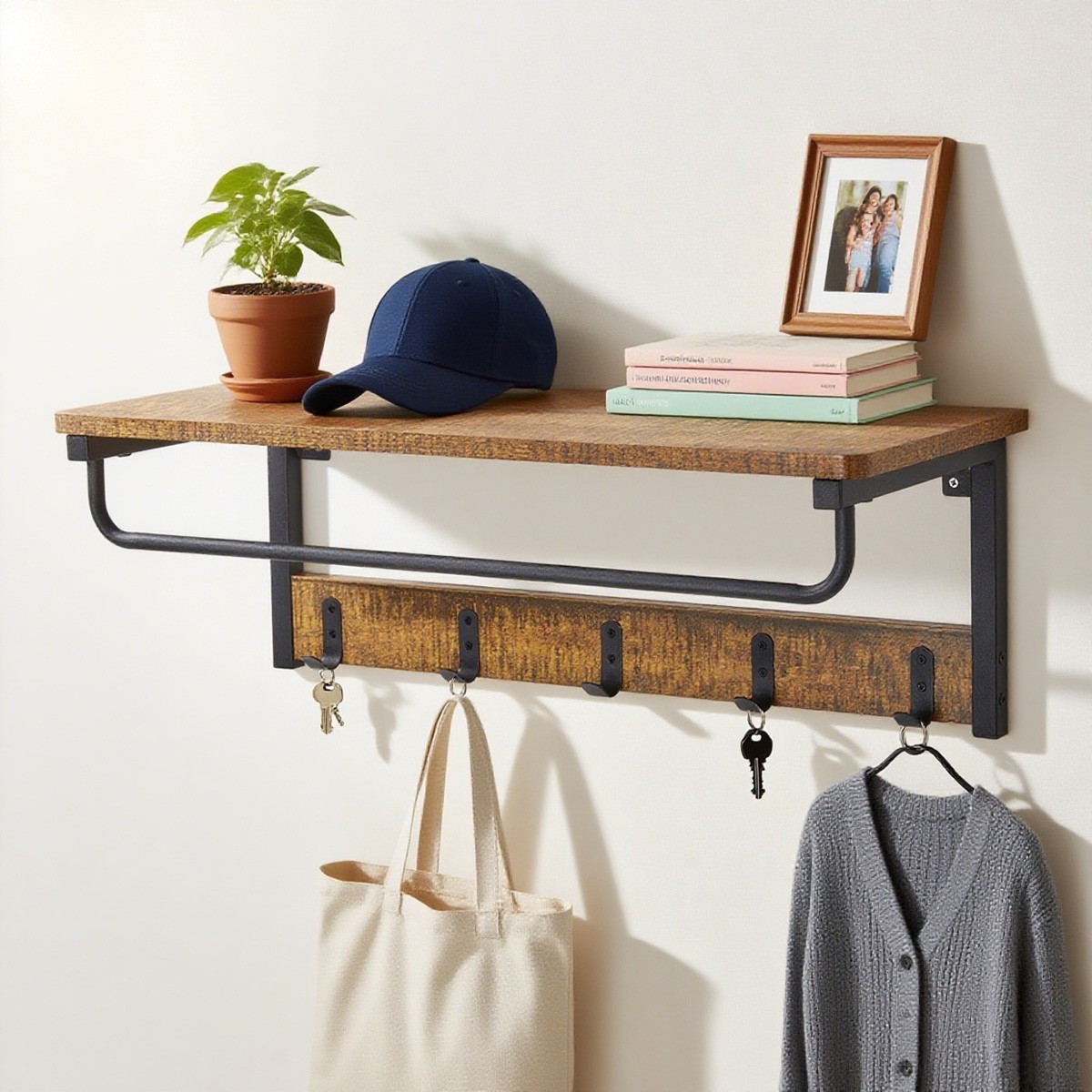 Load Capacity of Hanging Rail: 10 kg. 1 x Wall Mounted Coat Rack. Expansion bolts are installed correctly to ensure a long service life and good load-bearing performance of the product. The shelf can support 15 kg, each hook weighs 3 kg, and the hanging rod weighs 10 kg.