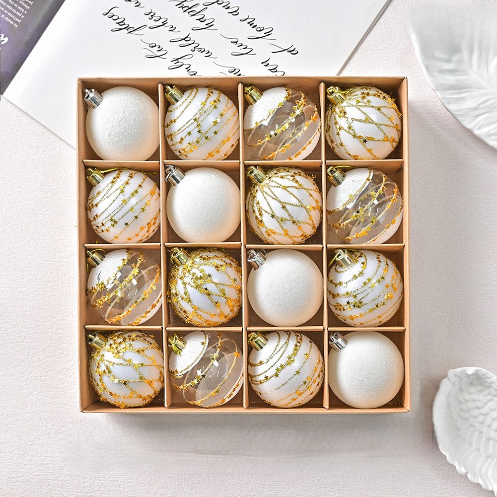 Set of 16 Christmas Ball Ornaments White and Gold Glitter in Box Packaging