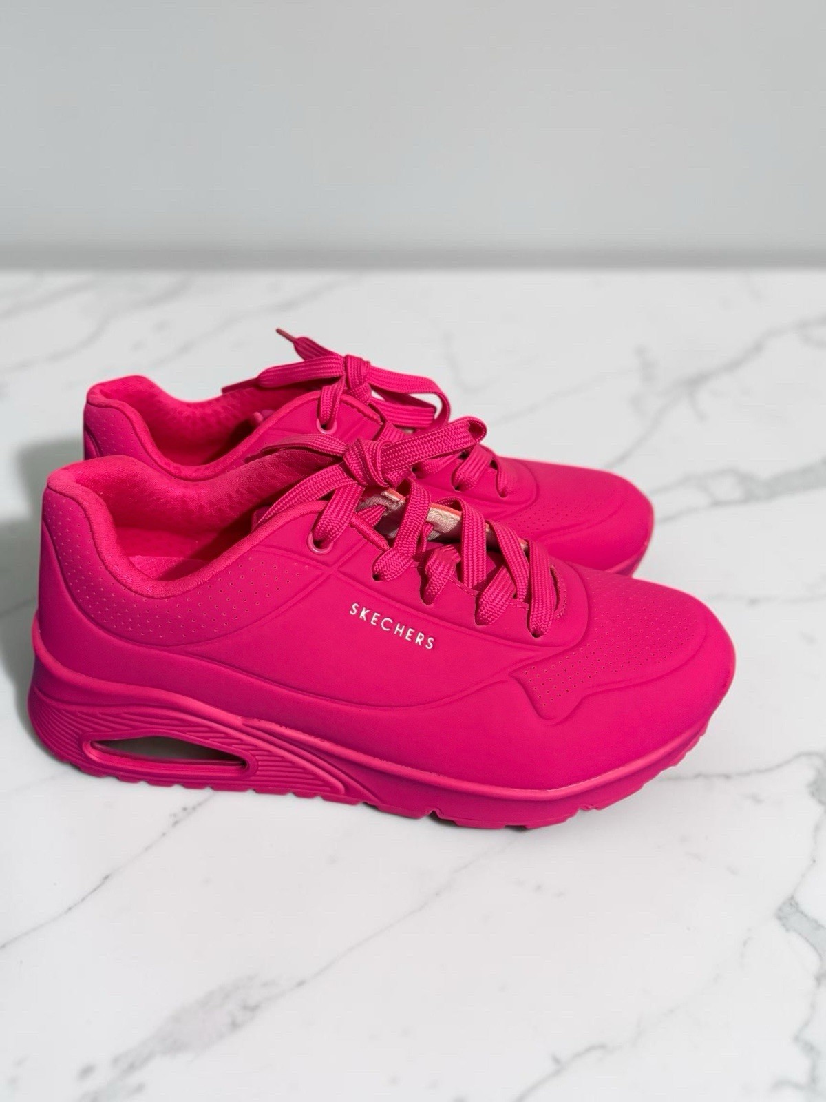 The Skechers Uno Night Shades Women's Size 7 Pink Athletic Running Shoes Sneakers are stylish and comfortable athletic shoes designed for casual wear. These low-top sneakers feature a solid pink color with a rubber outsole and memory foam insole for added comfort. The shoes are great for walking and are perfect for the summer, fall, and spring seasons. With a synthetic upper material and foam insole, these Skechers sneakers are a great addition to any woman's wardrobe, offering both style and functionality. Size 7.