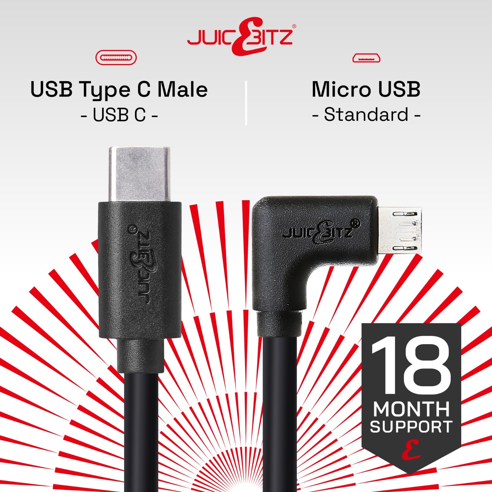 JuicEBitz® Core Series USB-C to Micro-USB Heavy Duty Charger Cable Data Lead - Universal. 100% compatible with all Micro-USB enabled devices on the market. 22AWG Tin Plated, 4N Grade 99.99% OFC Pure Copper Charging Cores and 28AWG comparable data lines for High-Speed data transfer (USB 2.0, 480 Mbps). Get flawless/low resistance, faster charging times from a heavy duty, safe, reliable charger cable. Can be used with Mobile Phones, Tablets, Cameras, GPS and Satellite Navigation Systems, PS4 & Xbox One Controllers - Amazon Kindle/Paperwhite/Firesticks + Ring Doorbells, Keyboards, Mice and more. Choose Straight or Angled connectors. Includes 2 x Velcro cable ties. 0.5m, 1m, 2m, 3m, 4m, 5m. 18 Month Warranty.